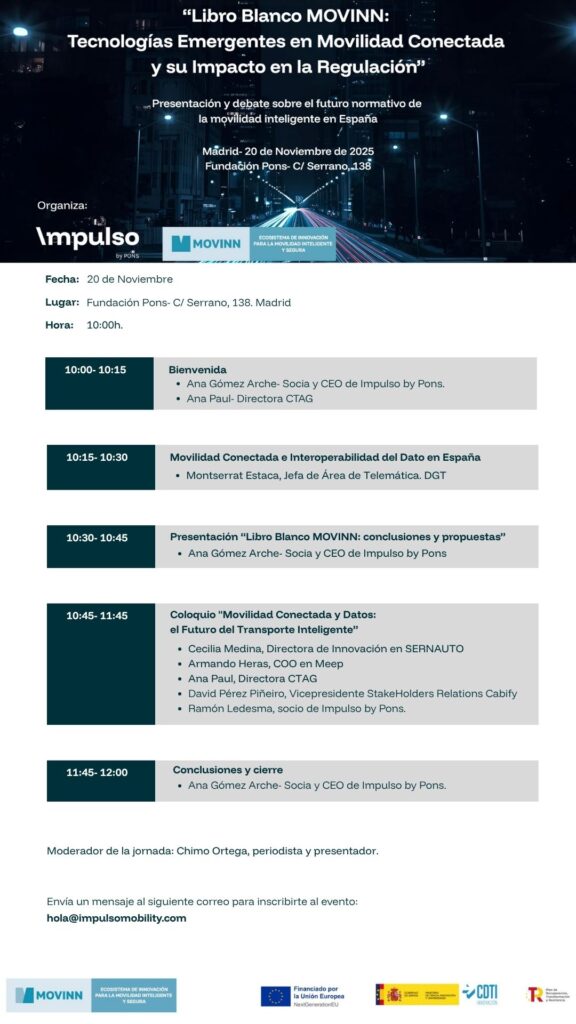 El evento, que se celebrará en Fundación Pons, se enmarca dentro del proyecto MOVINN, enfocado en la movilidad inteligente y segura. Con la presentación del Libro Blanco sobre Movilidad Conectada, Impulso by Pons busca fomentar la colaboración entre los actores del sector, avanzando en el despliegue de la movilidad conectada, cooperativa y automatizada (CCAM), con el apoyo de CIDAUT, CTAG y de plataformas especializadas en movilidad autónoma y sostenible.
